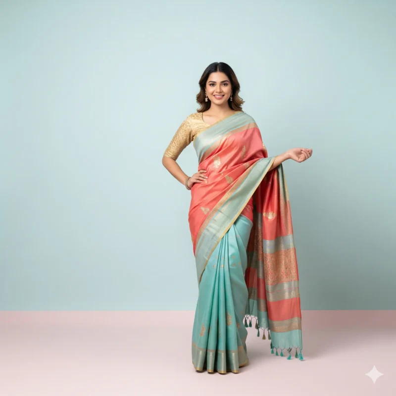 This stunning sea green silk saree is the epitome of elegance and tradition. Featuring delicate floral embroidery in shades of pink and blue, it is beautifully complemented by a contrasting navy blue border with intricate golden and pink detailing. Perfect for weddings, festive occasions, or cultural celebrations, this saree pairs gracefully with gold jewelry and bangles, creating a timeless and sophisticated look.