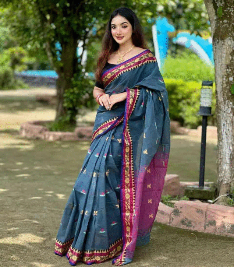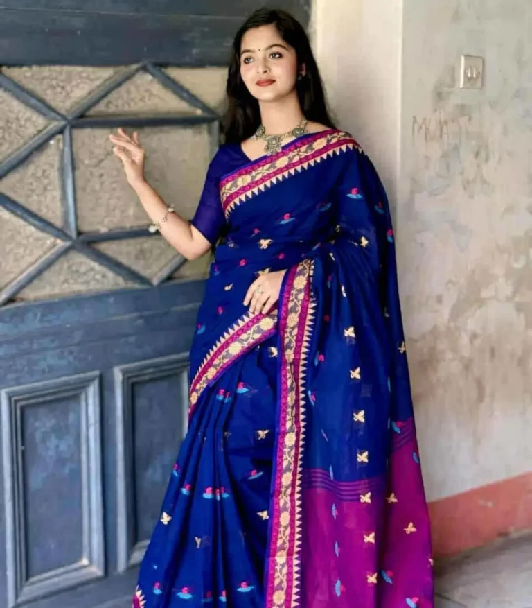 This elegant white saree with a royal blue and golden border reflects timeless beauty and cultural grace. The subtle yet sophisticated design is perfectly complemented by oxidized silver jewelry, adding a touch of vintage charm. Ideal for traditional ceremonies, festive celebrations, or cultural events, this saree exudes simplicity, elegance, and heritage, making it a perfect choice for those who love classic ethnic fashion.